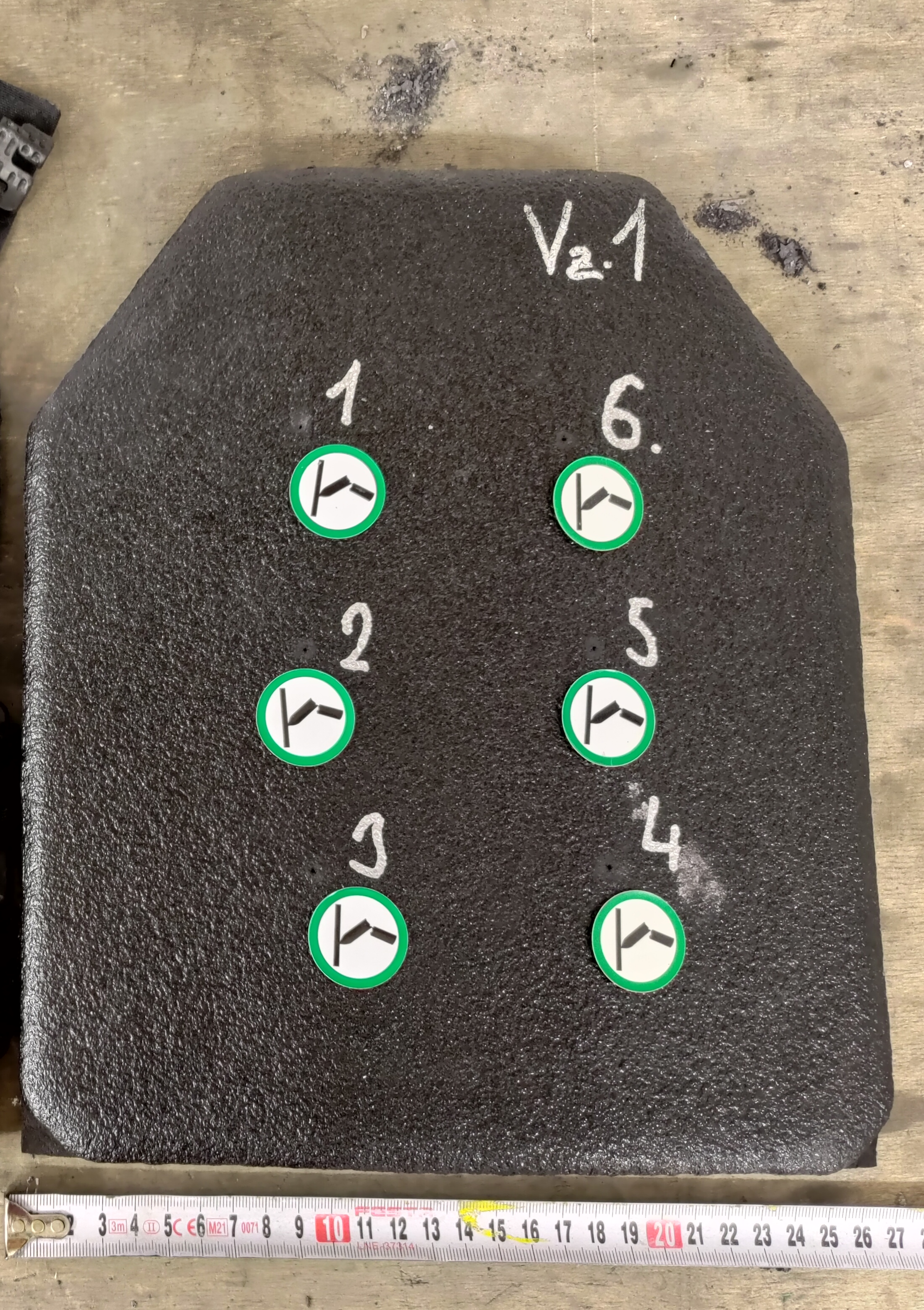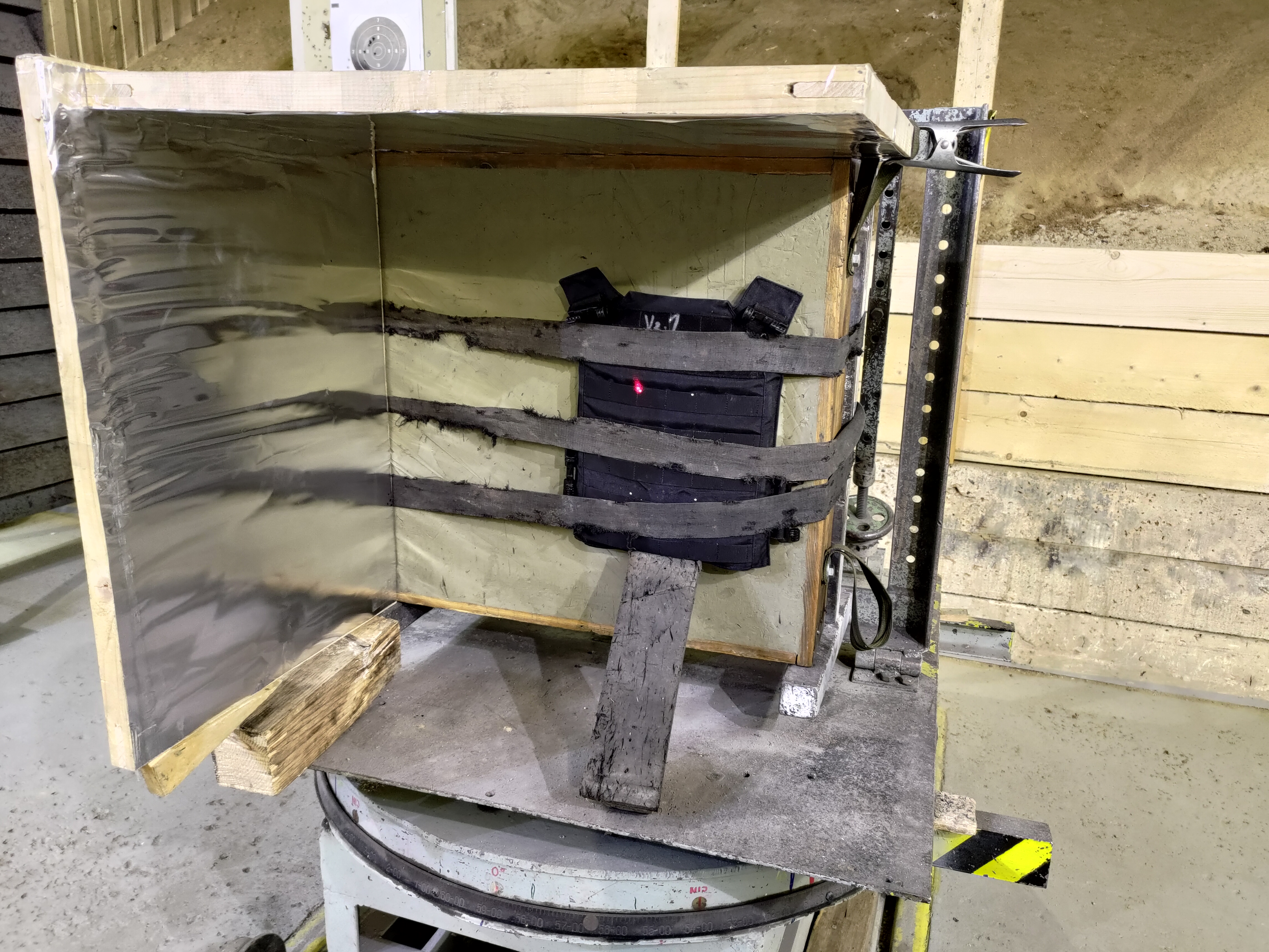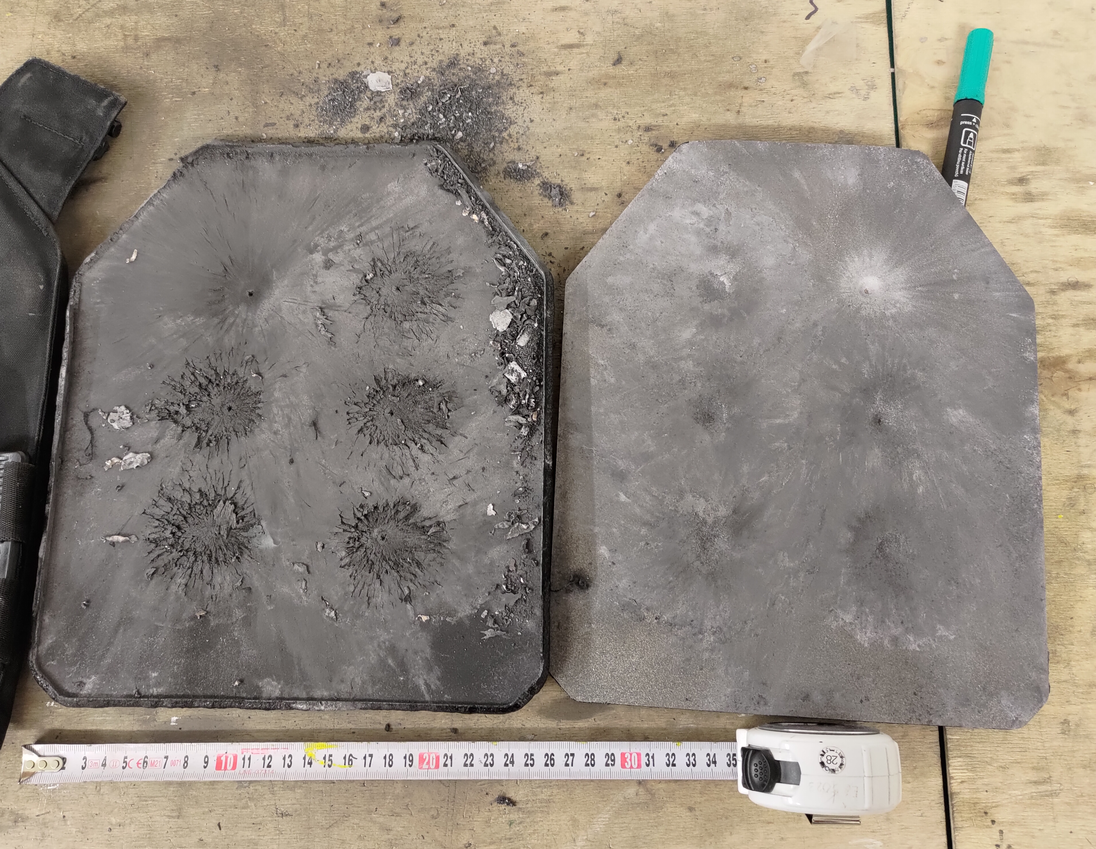Testování proběhlo dle normy NIJ STD 0101.04 - navíc vždy s aluminiovou svědečnou tabulí, která sloužila k zaznamenání úletu střepin